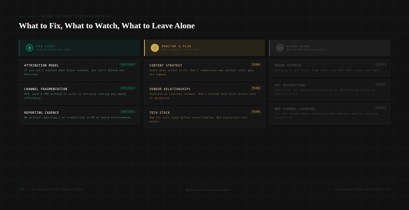 The decision matrix above captures the framework at a glance. The "leave alone" column is where most CMOs make their costliest early mistakes — here's the reasoning behind each deferral.