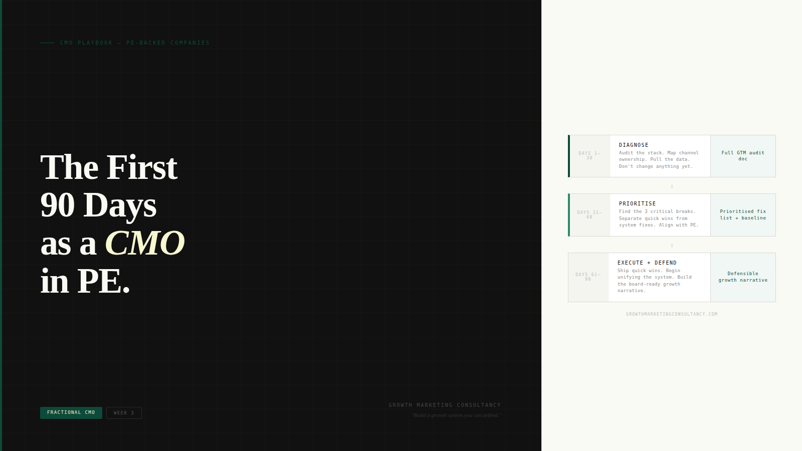 Growth Marketing Consultancy works with PE-backed and founder-led mid-market companies to build unified growth systems that produce a predictable pipeline and defensible reporting. If you're a new CMO navigating the first 90 days, book a Growth System Audit.
