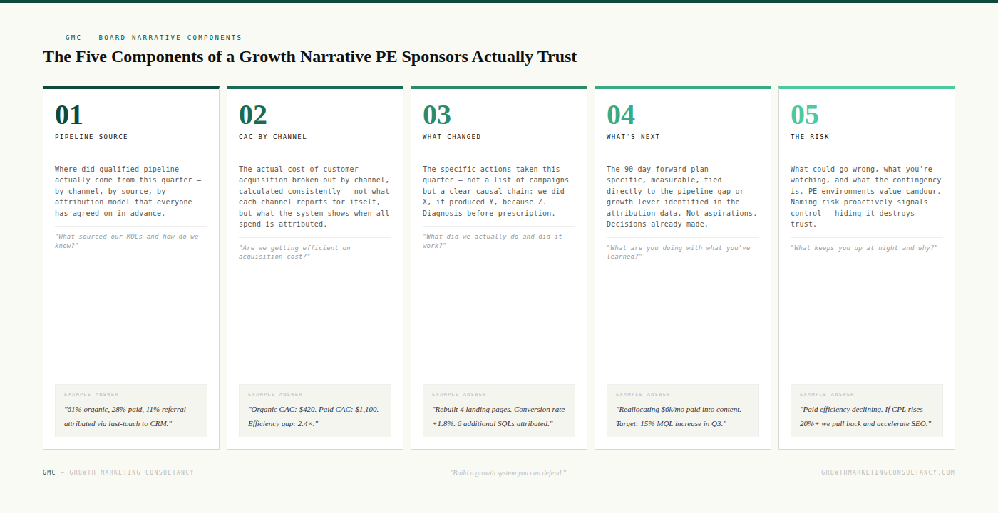 Component 5: The risk. What could go wrong, what you're watching, and what the contingency is. This is the component most CMOs skip, and it's the one that builds the most credibility with PE sponsors. Naming risk proactively signals that you're in control of the system. Hiding it signals that you're not.