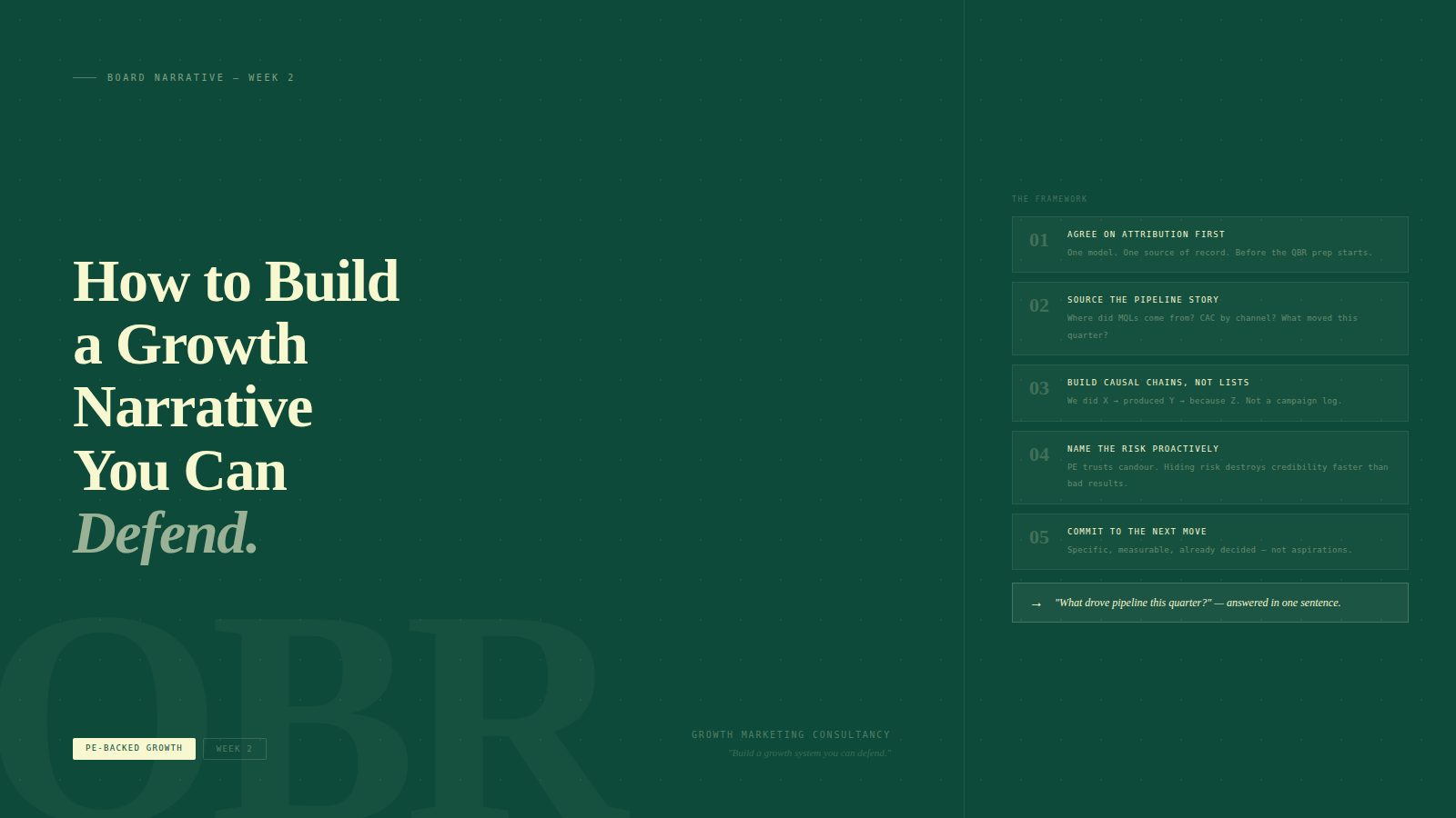 Growth Marketing Consultancy builds unified GTM systems for PE-backed and founder-led mid-market companies. If your next QBR is coming up and your growth narrative isn't where it needs to be, book a Growth System Audit.
