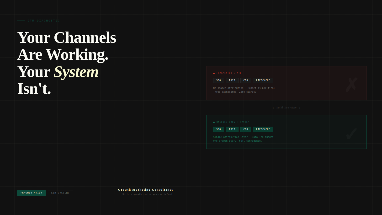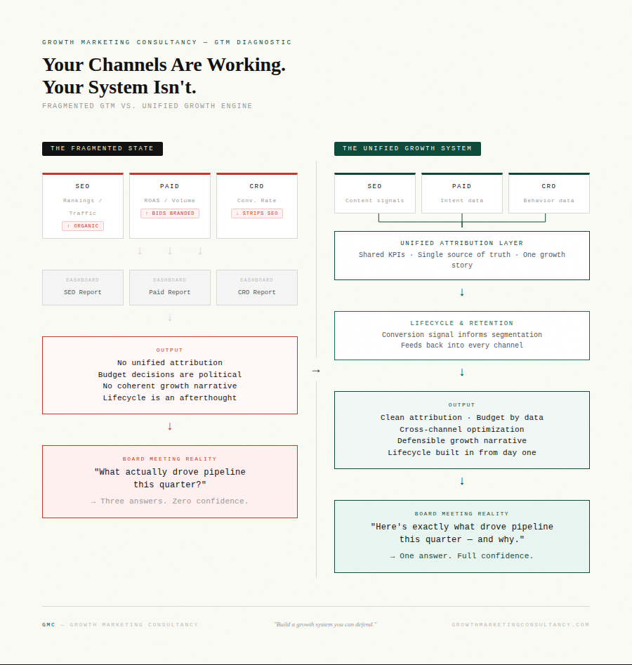 Growth Marketing Consultancy builds unified GTM systems for PE-backed and founder-led mid-market companies. If your channels aren't talking to each other, book a Growth System Audit.